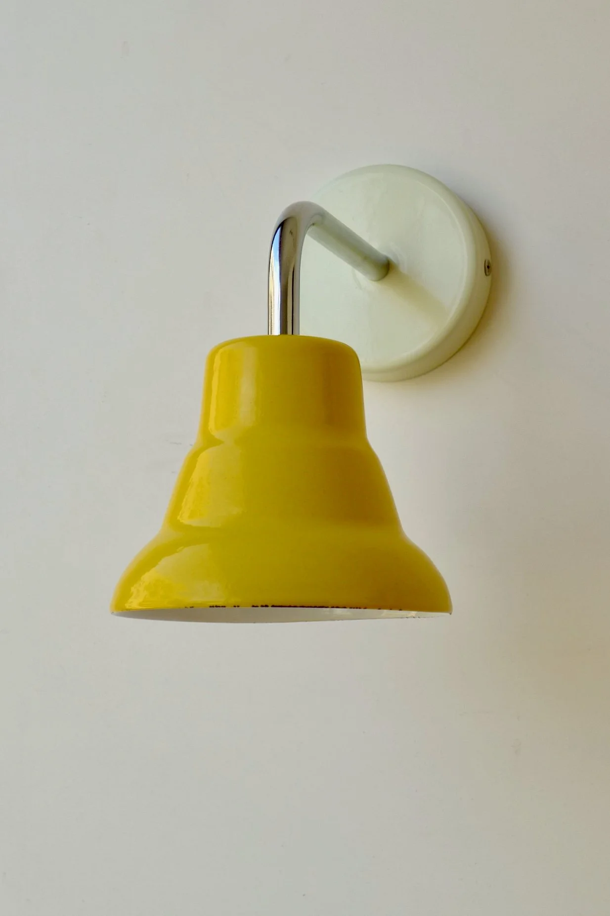wall mini in yellow with a pistachio base Industrial in yellow with royal blue brim and speckles, and a royal blue cord